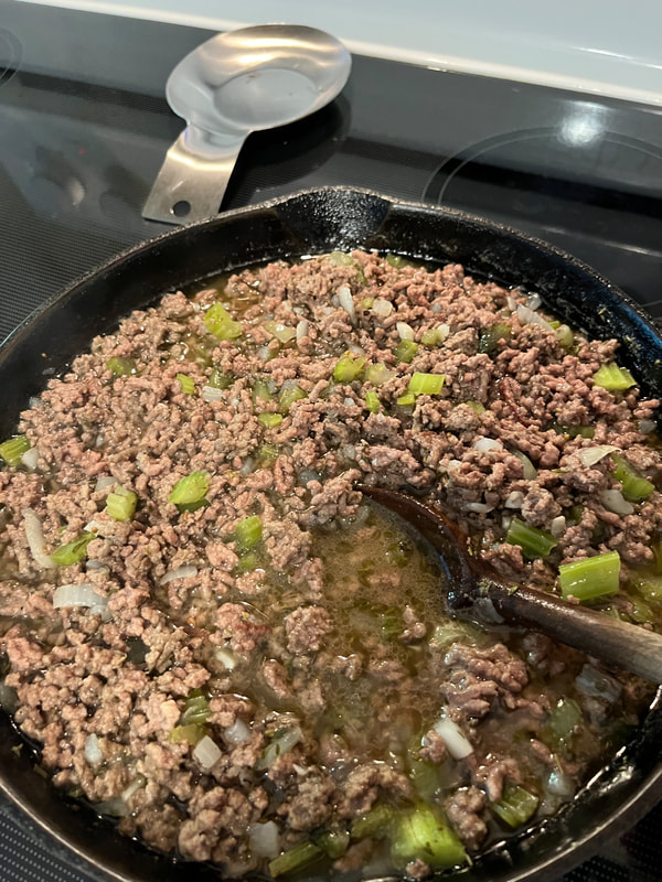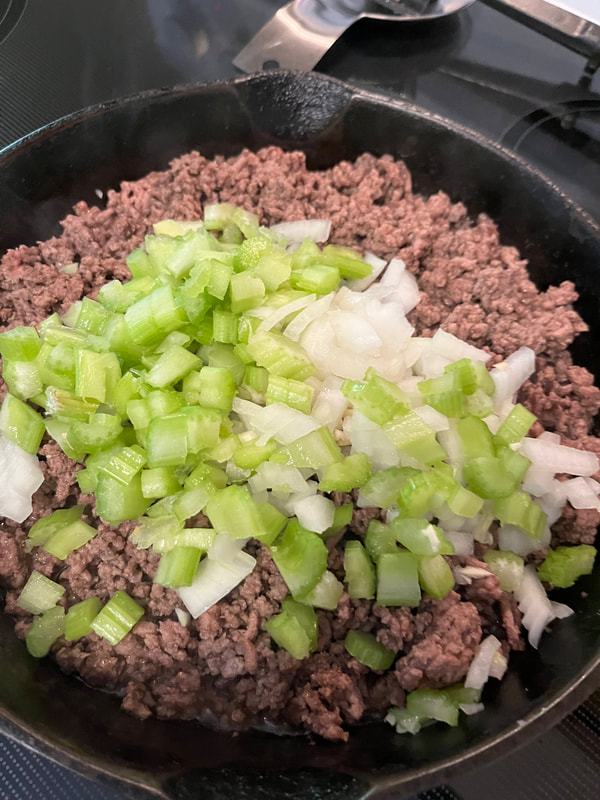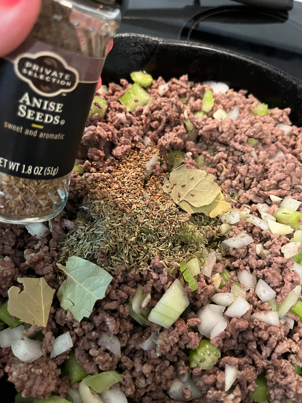 I just browned the meat and then added the veg and spices and herbs to the pan. It seemed to work ‘OK’, (although his way would give it a MUCH better flavor).